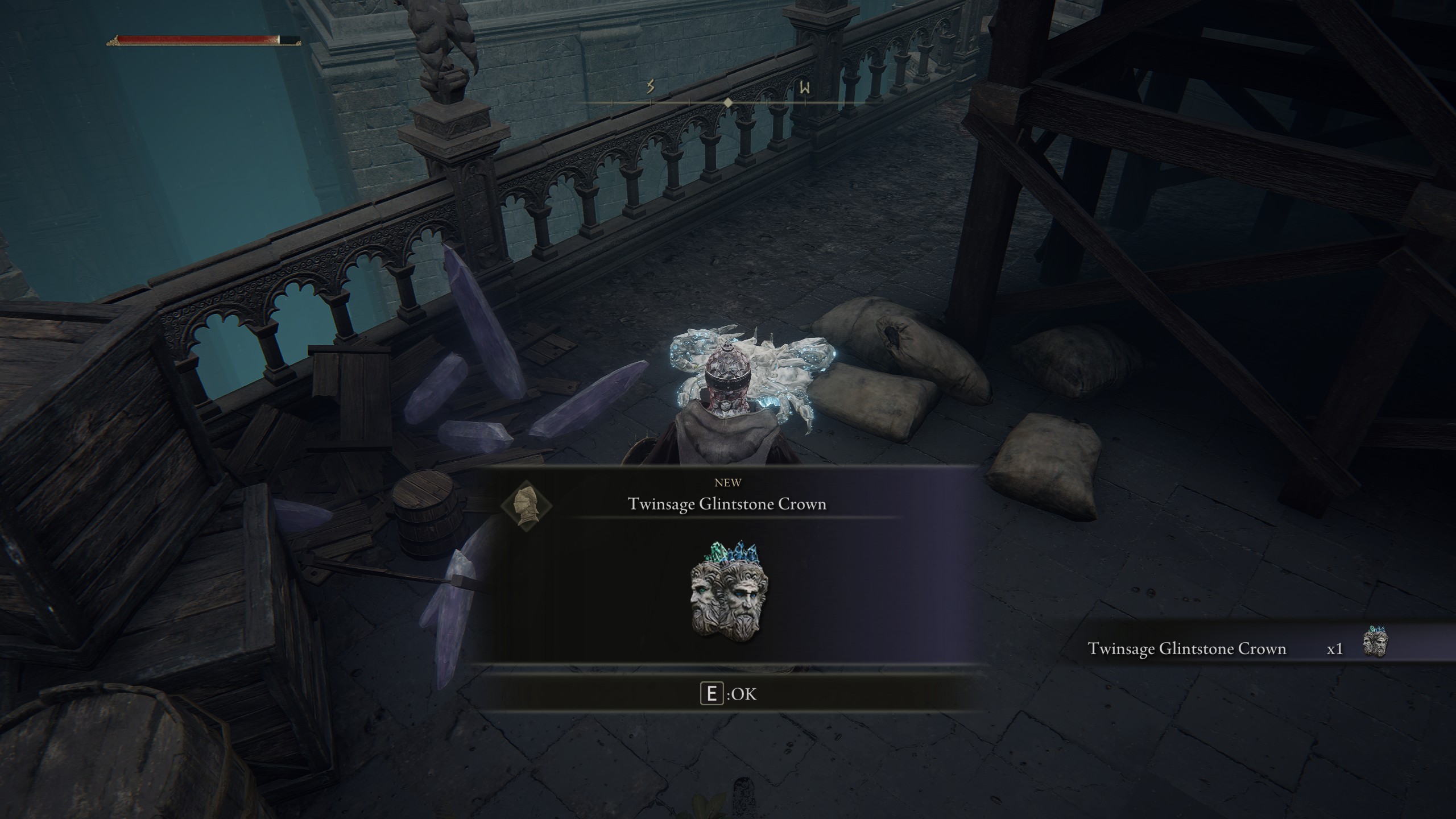Tuttavia sarà possibile usare tale scorciatoia solo avendo già visitato il piano superiore e, quindi, avendo abbassato la scala (in caso contrario dovremo usare il secondo metodo per raggiungere la Twinsage Glintstone Crown). Raggiunto il secondo piano usiamo il ponte immediatamente alla nostra sinistra e usciamo sulla terrazza che si trova davanti a noi. Dirigiamoci sul lato destro dove troveremo un Crystallized Crab (Granchio di Cristallo) che, una volta ucciso, dropperà la Twinsage Glintstone Crown.